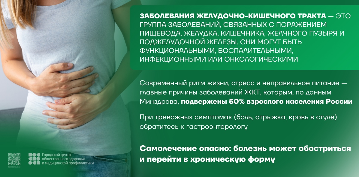 Городским центром общественного здоровья подготовлены материалы, охватывающие ключевые аспекты профилактики заболеваний ЖКТ, включая правильное питание, важность физической активности и своевременное обращение к врачу.